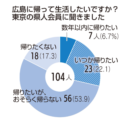 広島に帰って生活したいかとの問いには、7人が「数年以内に帰りたい」、23人が「いつか帰りたい」と回答。